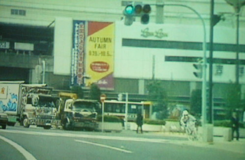 高橋良明こと遊介がトラックと競争中にサンロード商店街を暴走するシーン。