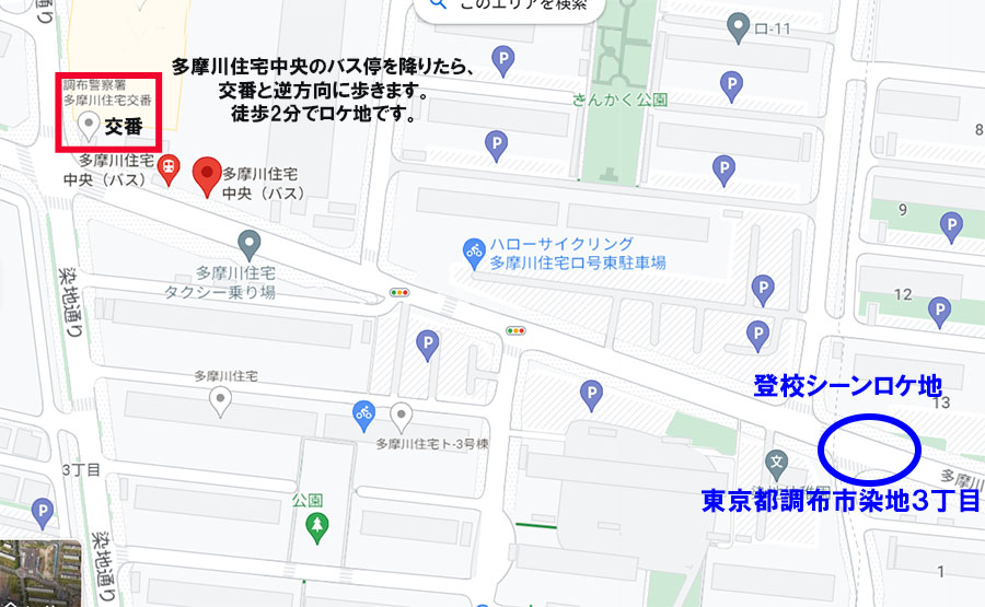 いずれも、バス停下車後、交番と逆方向に歩いてください。(ロケ地まで、徒歩2-3分)